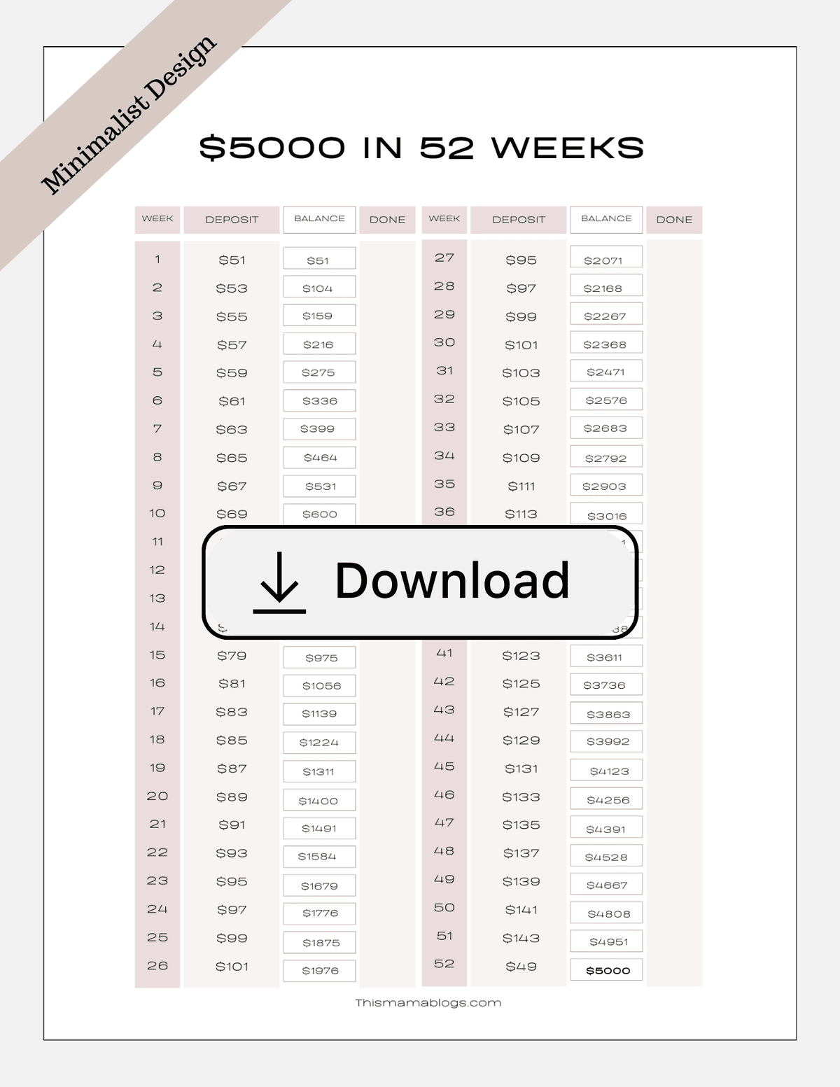 You can download this beautiful $5,000 savings tracker by signing up in the form below. Simply check off each box as you save to track your progress!